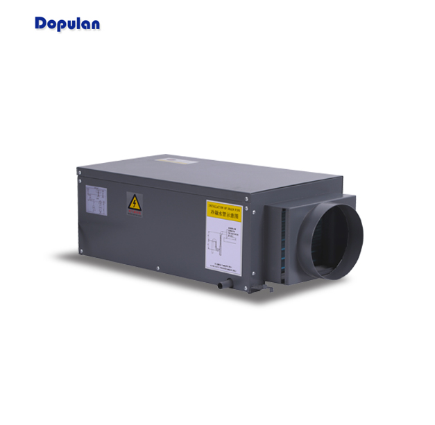 多浦家用吊顶除湿机采用压缩机制冷除湿原理,首先压缩机压缩冷媒,使蒸发器冷却,随着温度降低到空气露点温度以下时,其中所含水蒸气将被凝结下来,由蒸发器下部滴水盘排出,如此不断循环使室内湿度逐渐降低。吊顶式除湿机可与通风管道配合及配合风阀使用,也可单独使用。