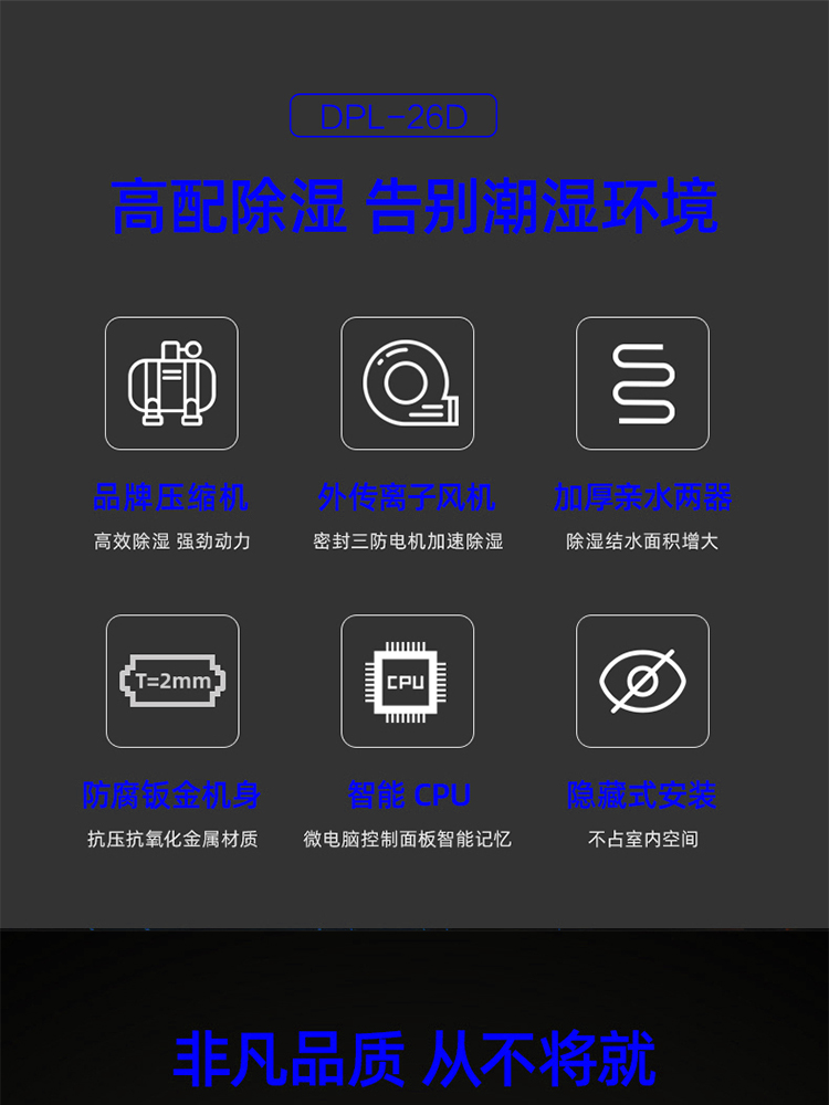 * 湿度智能控制,超出设定值自动运行除湿,达到设定值自动待机