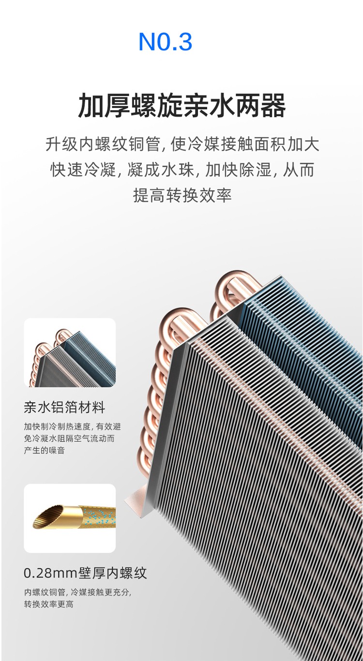 6、两器采用亲水铝箔亲水翅片,加厚内螺纹铜管,换热效率高